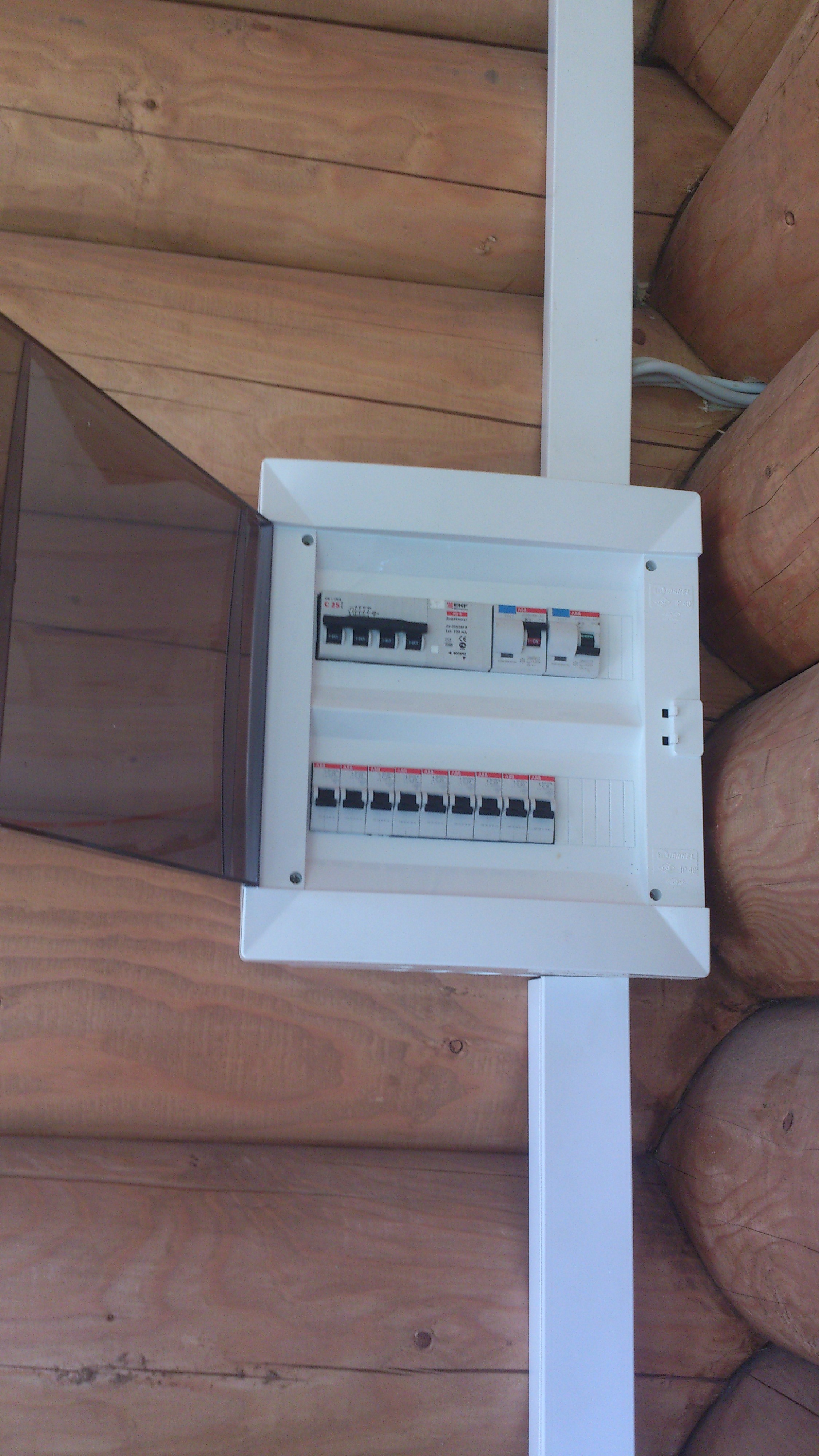 ЩитТип объекта: Дачный дом Собранный щит в дачном доме. На входе стоит дифф.автомат 3-х фазный 25А , Узо на стиральную машнку, узо на водонагреватель и автоматы, по группам. Вся проводка в доме была выполнена кабелем NYM в кабельном канале. Ввод идет со столба, под землей бронированным кабелем 4x6(дополнительно в трубе ПВХ) . 1х16 проводом заведено заземление в щит от контура заземления.