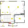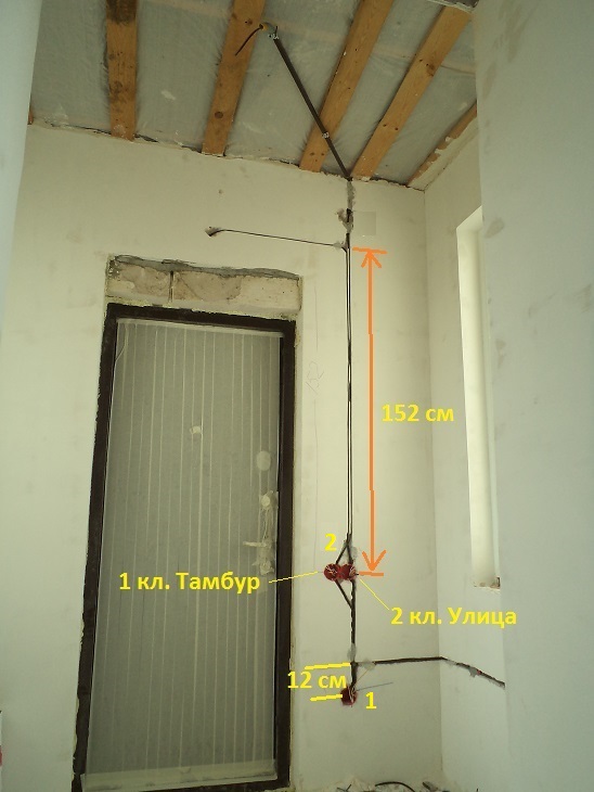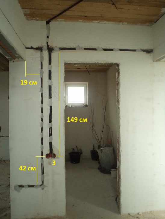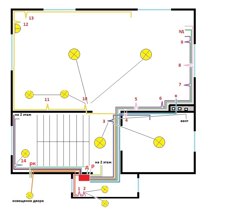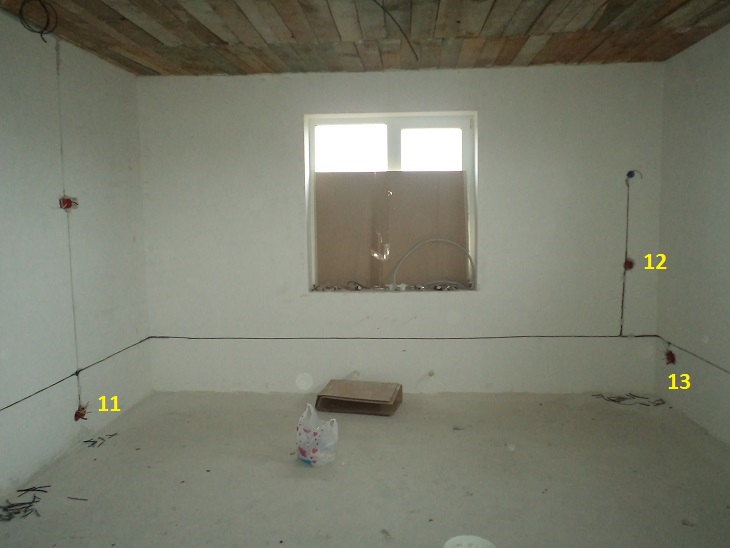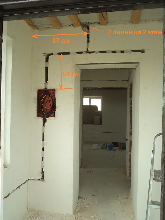 Двух этажный дом с комбинированной прокладкой кабелей: в штрабе, в гипсокартонных перегородках, по деревянным перекрытиям. Схема разводки - по-комнатно. Фотографии и схема выбраны из общего фото-отчета.