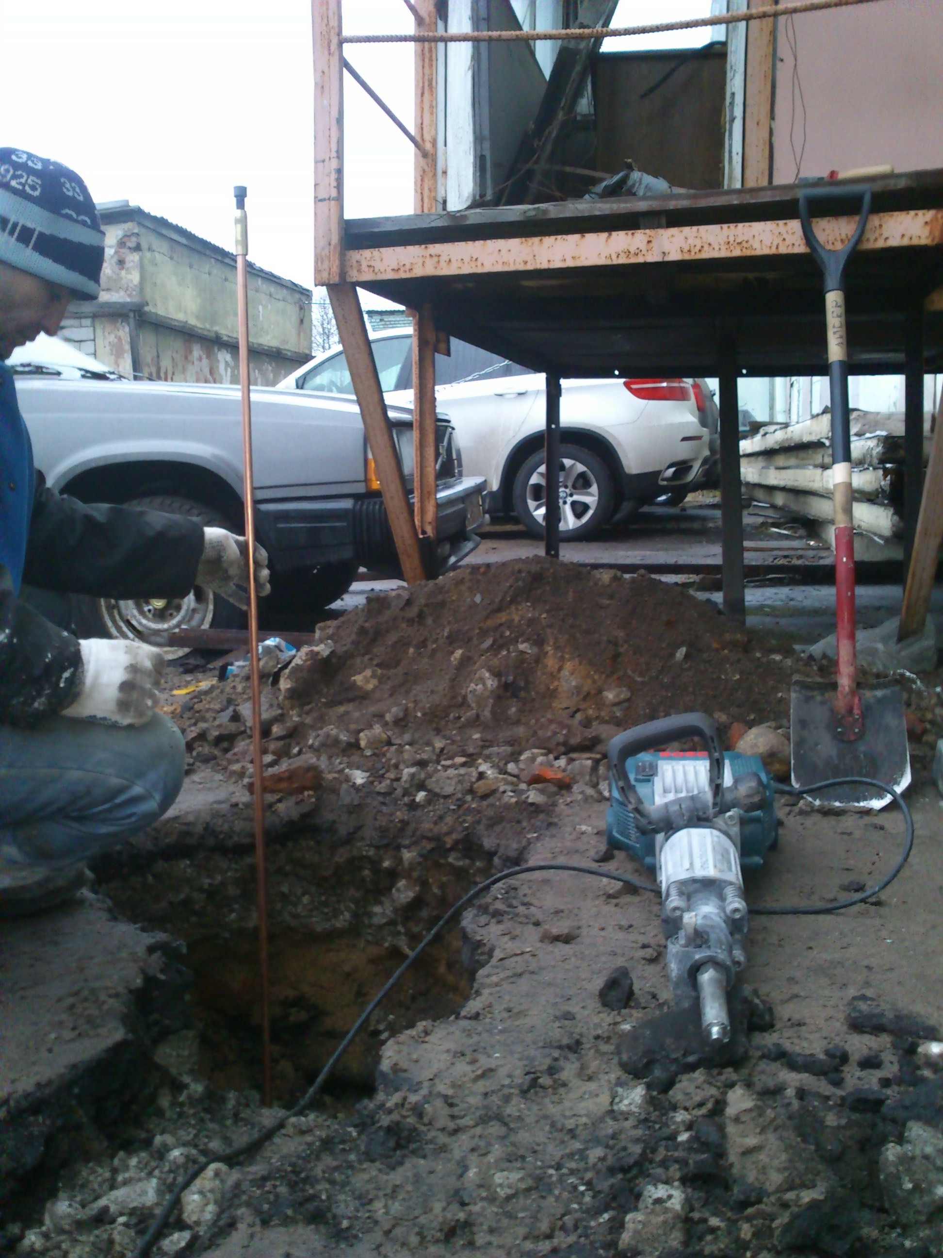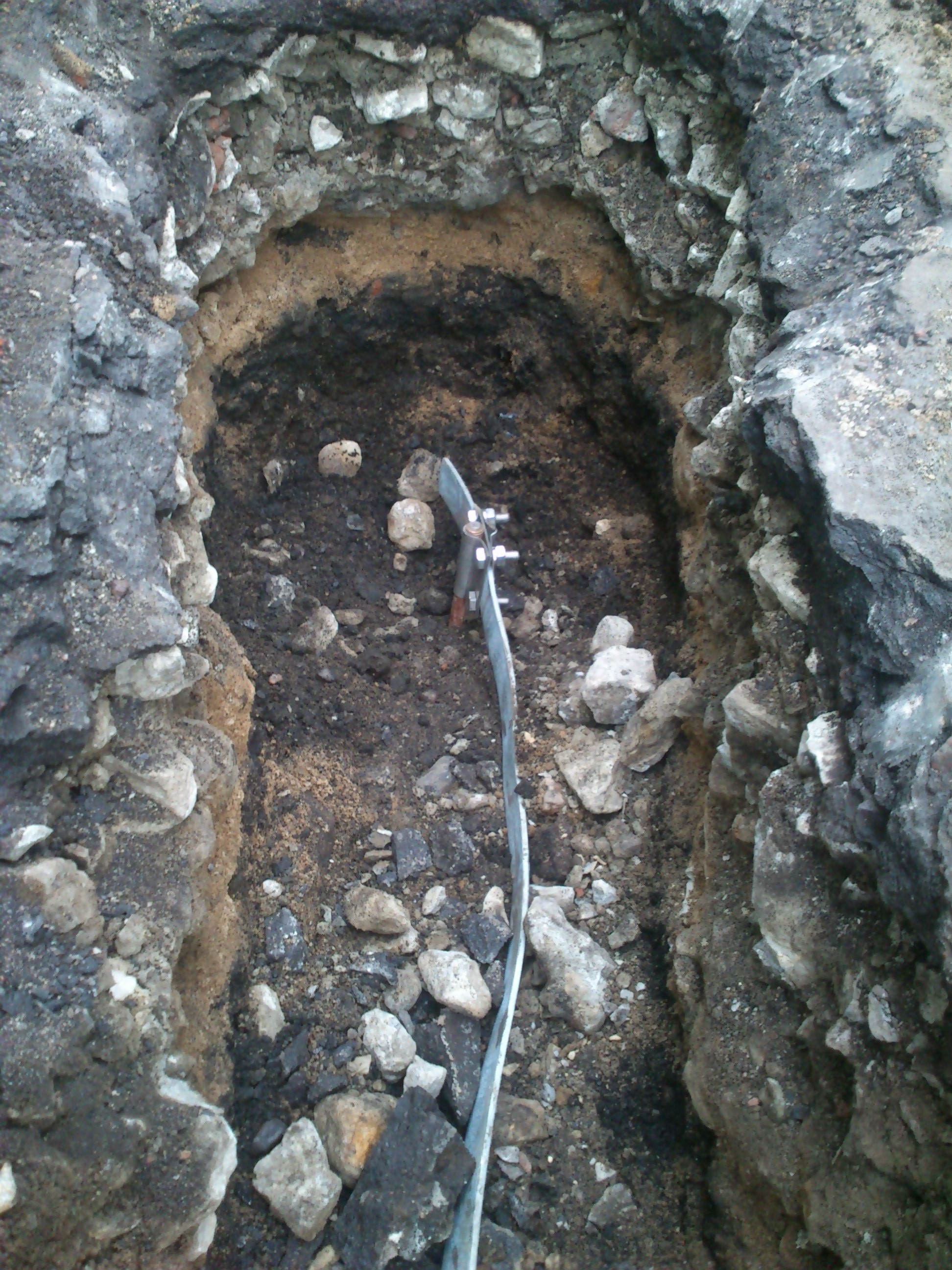 Монтаж модульного заземления, два стержня по 12 метров соединенных оцинкованной стальной полосой.