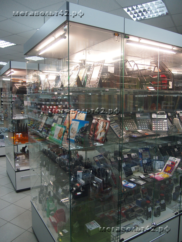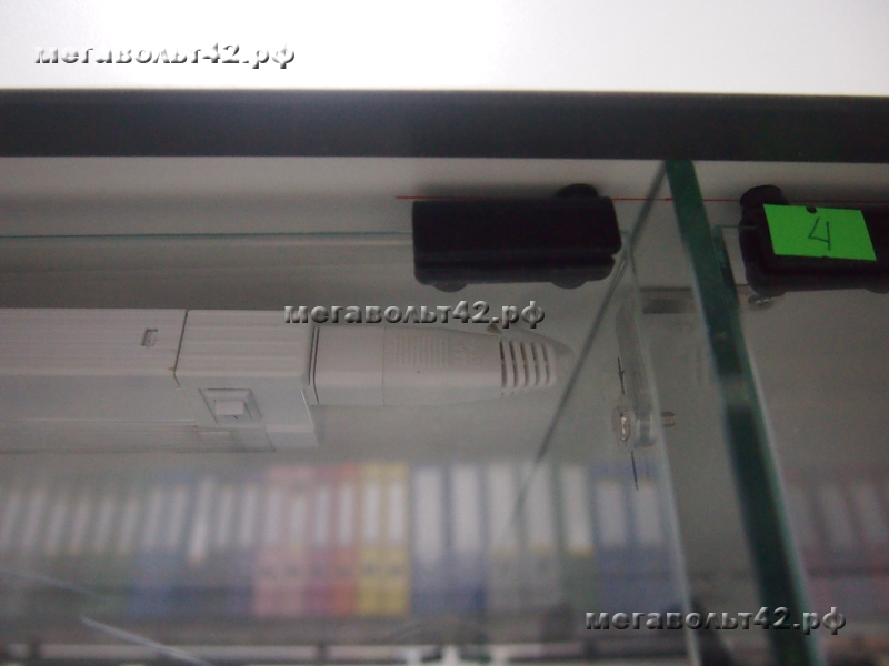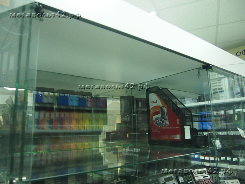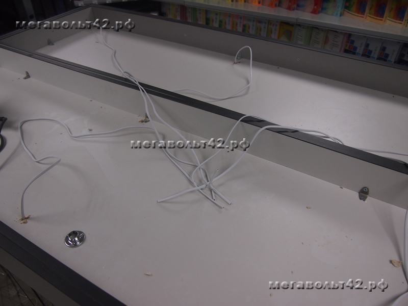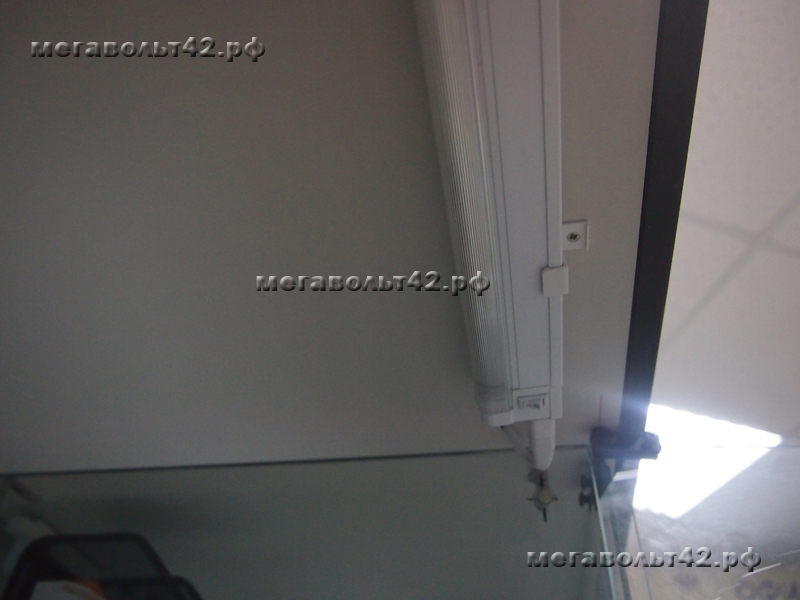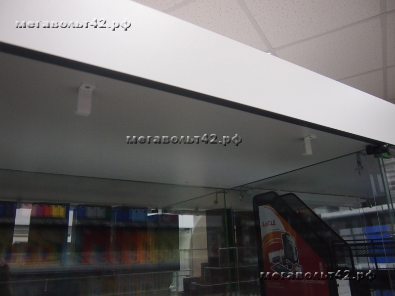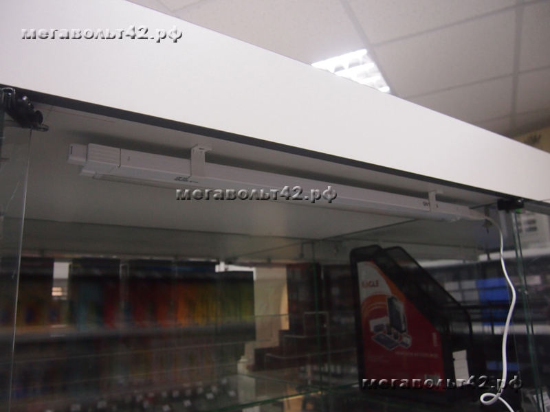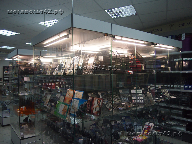 Подсветка витрин.Тип объекта: Другое общественное помещение Подсветка витрин в магазине "Офисные мелочи" по адресу ул. Кирова 37. Подсветка выполнена люминесцентными лампами. Подсвечено две витрины, в каждую установлено 5 ламп. Питание ламп подведено от основного освещения зала магазина. Питающий кабель с потолка до витрины проходит в хромированной металлической трубе диаметром 16 мм.