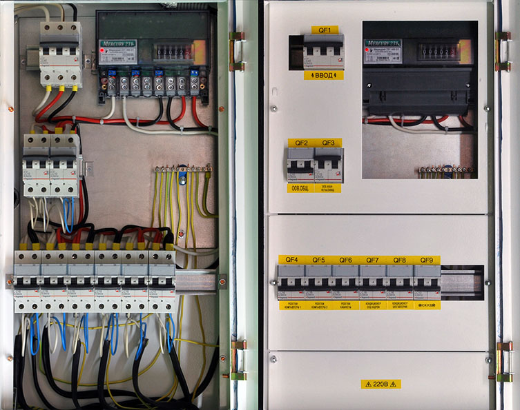 Распределительный щит смонтирован в металлическом навесном шкафу 700S 2.0 585х350х145мм производства «Щитэлектрокомплект». Щит укомплектован аппаратами защиты и коммутации производства Legrand серии TX3.
