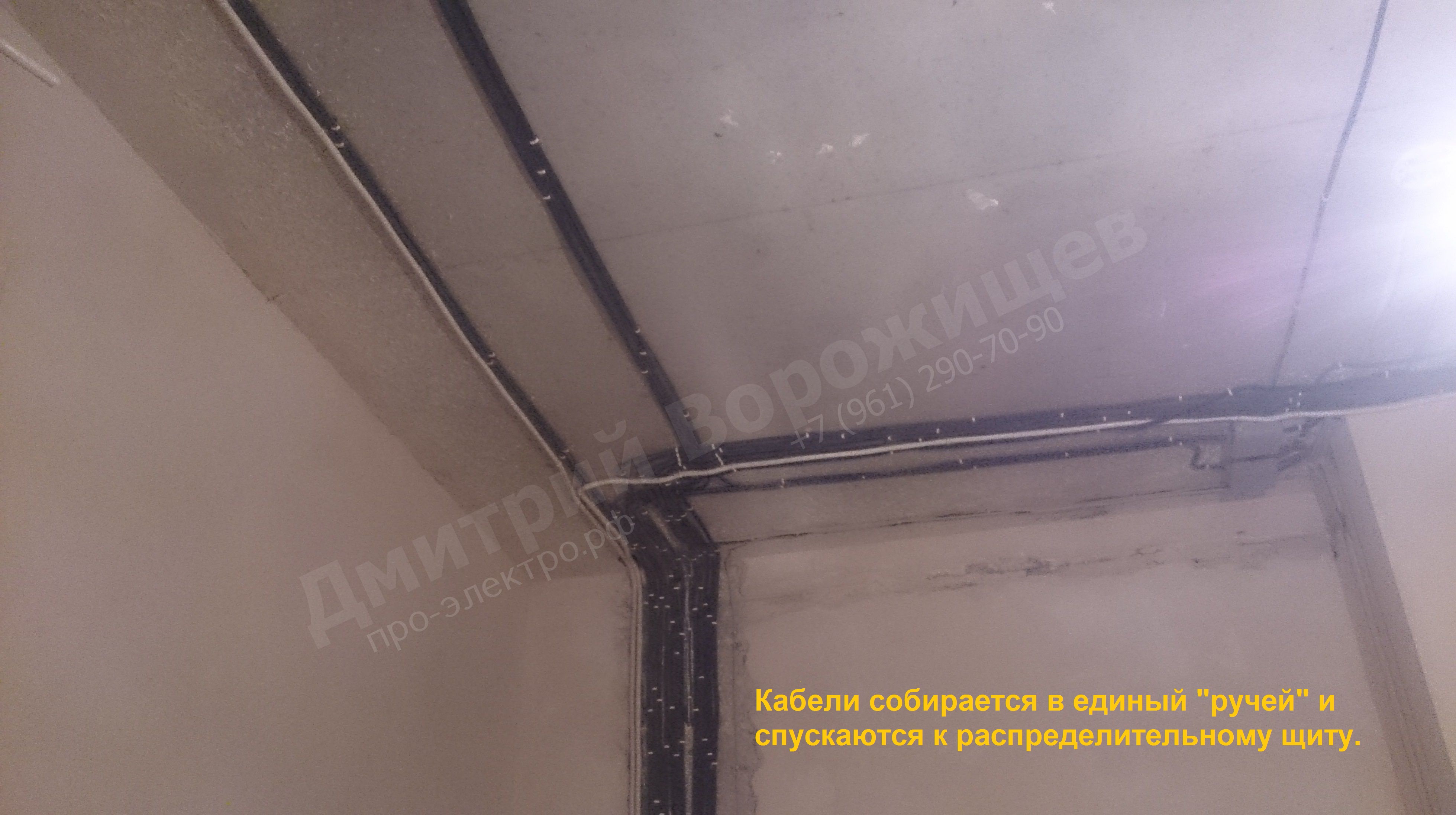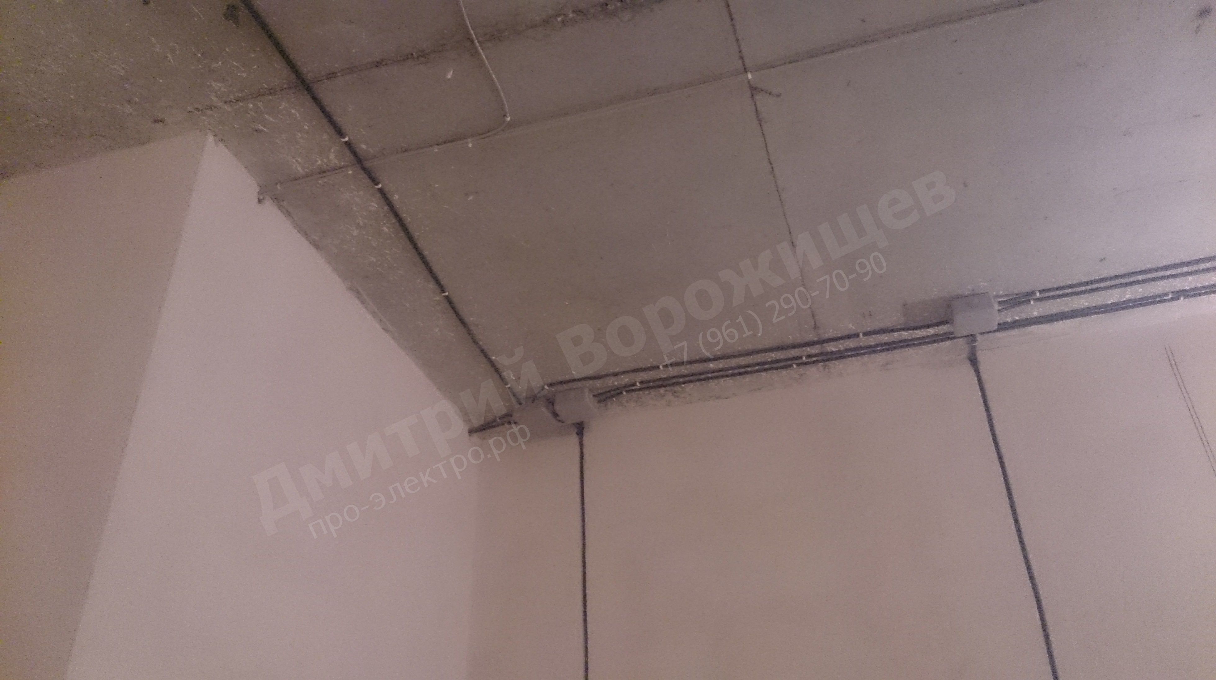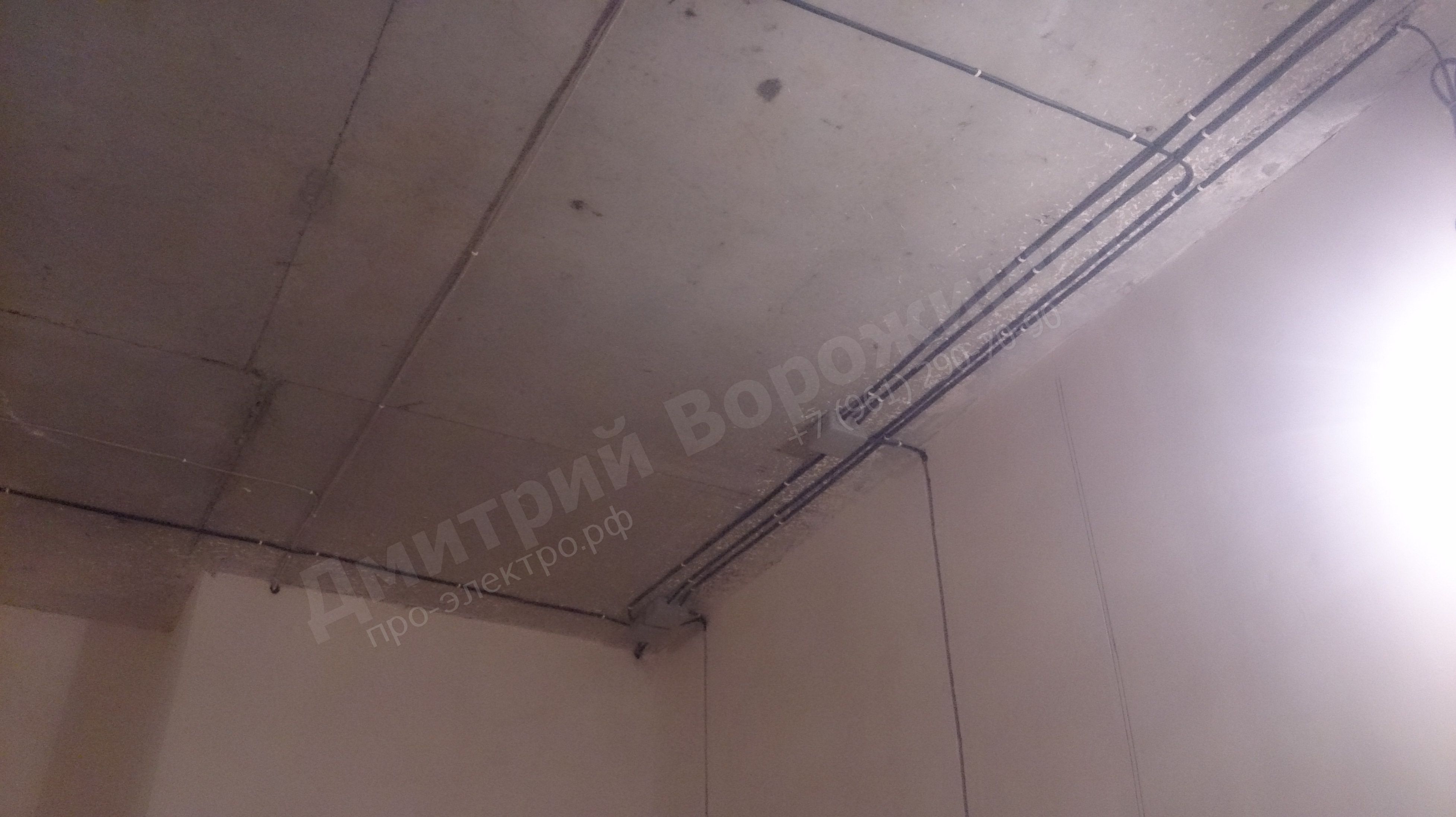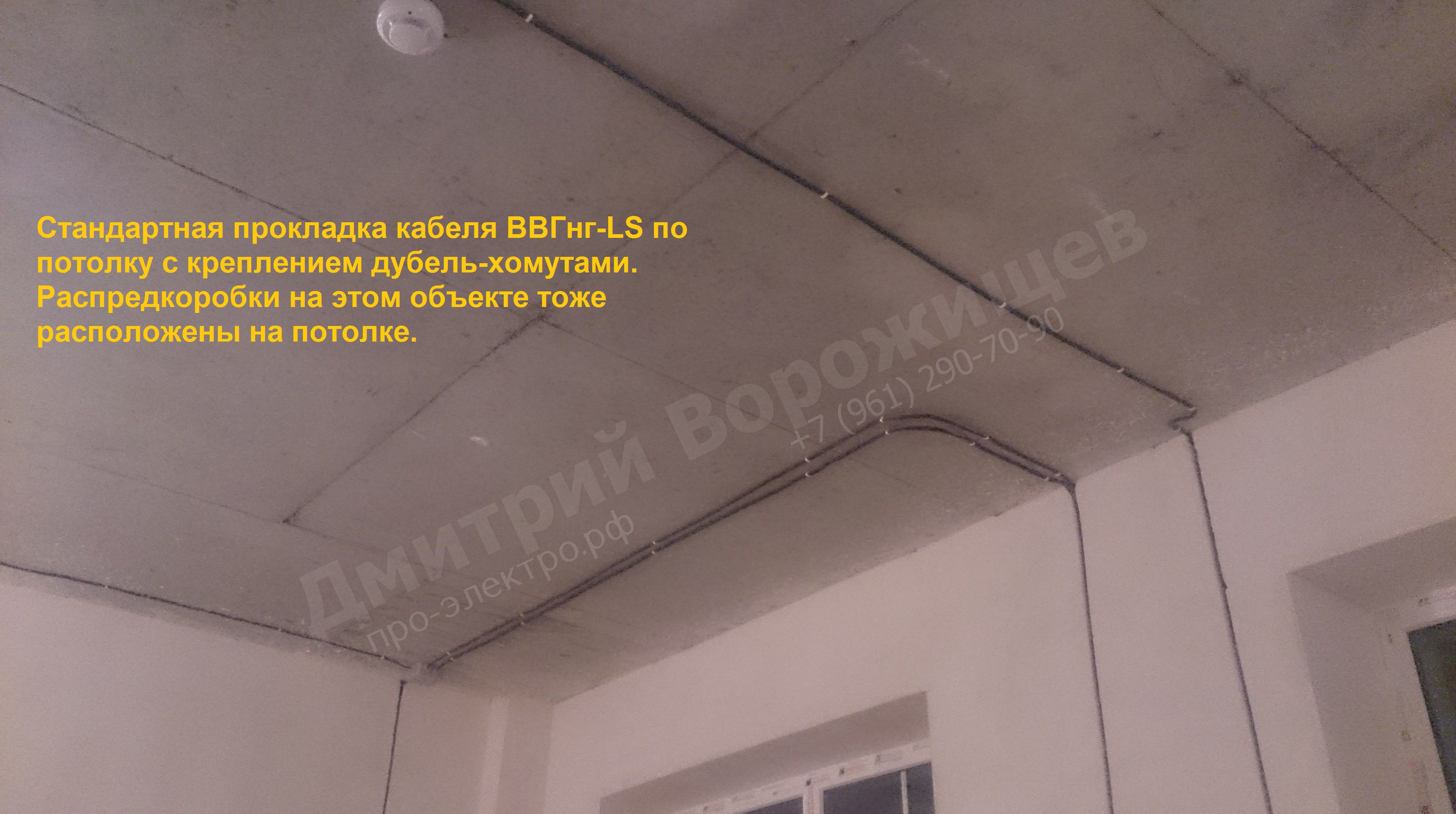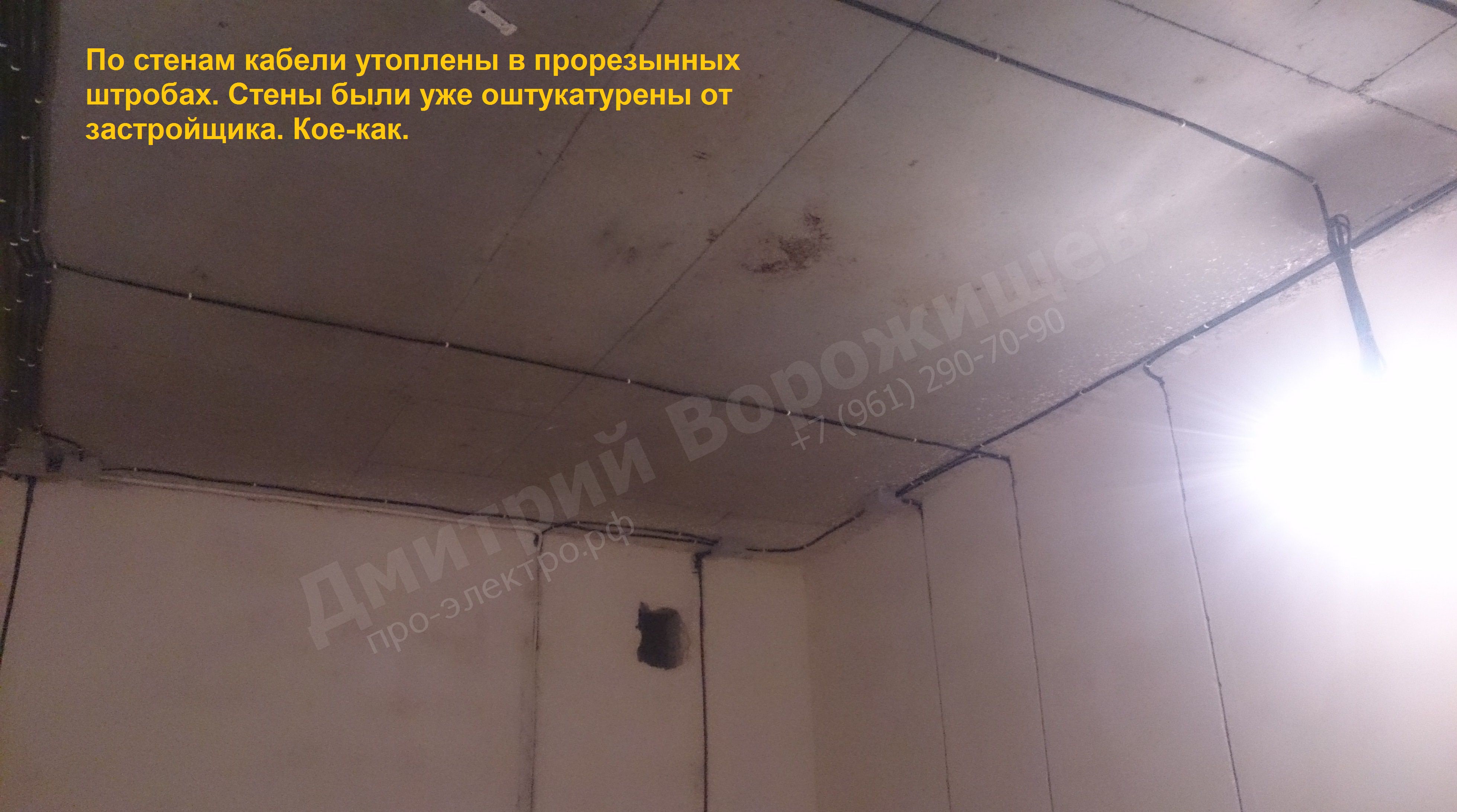 Монтаж электропроводки в 2к квартире ж/к "Чеховский сквер"Тип объекта: Квартира Площадь: 50-100 м. кв. Тип оборудования: Модульное ЗКО (защитно-коммутационное оборудование), ЭУИ (Электроустановочные изделия - розетки, выключатели, переключатели ...) , Слаботочные сети (Оборудование безопасности, компьютерные сети ...) Просторная квартира в элитном жилищном комплексе. Уйма контрастов. Подъезд замощен керамогранитом, но устанвлены плохие китайские автоматы в этажном распределительном электрощите; высокие потолки (3,5 м!), но кривые плохосложенные межкомнатные перегородки. Электромонтаж на объекте стандартный - прокладка кабеля ВВГнг-LS по потолку.
