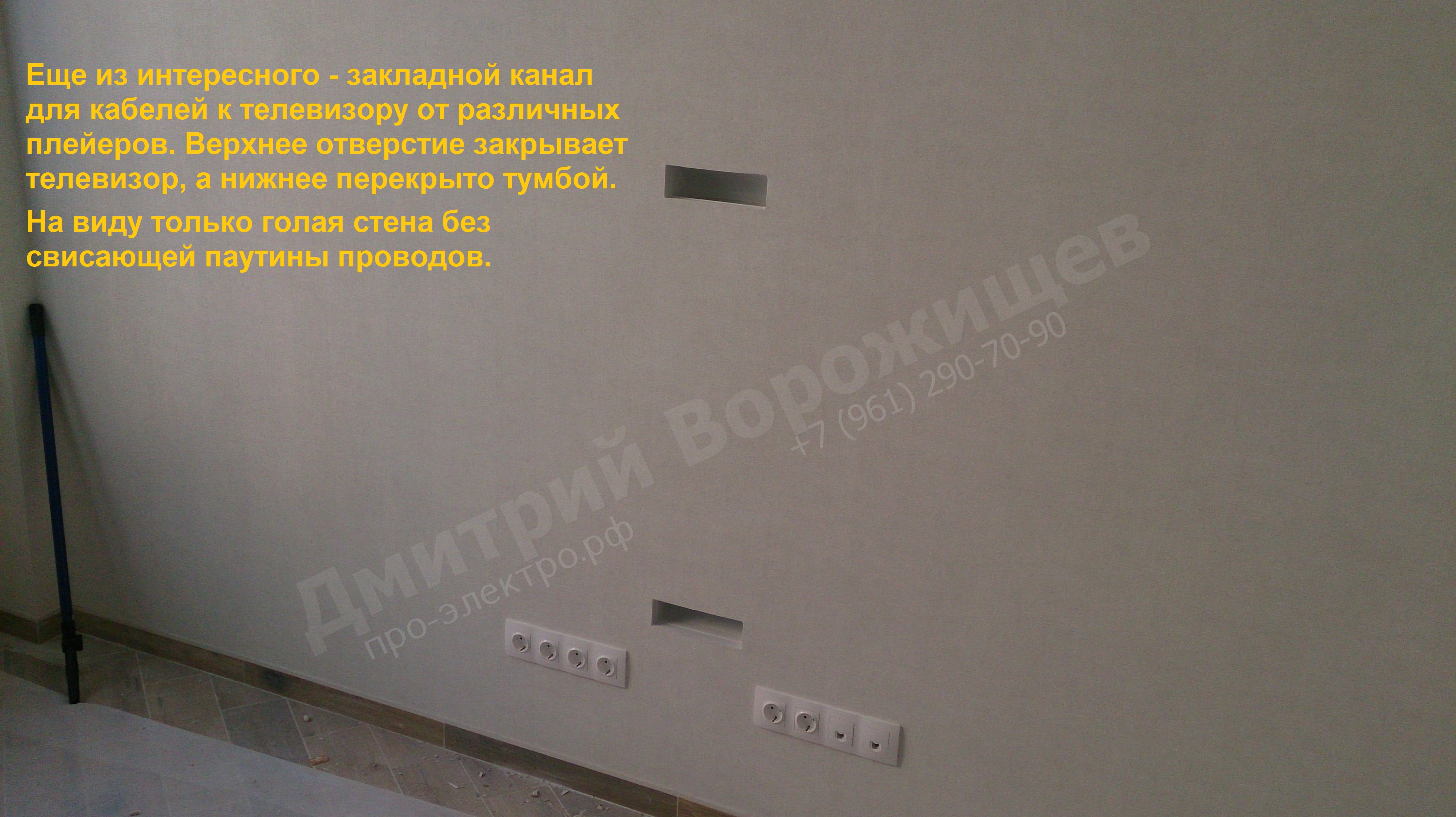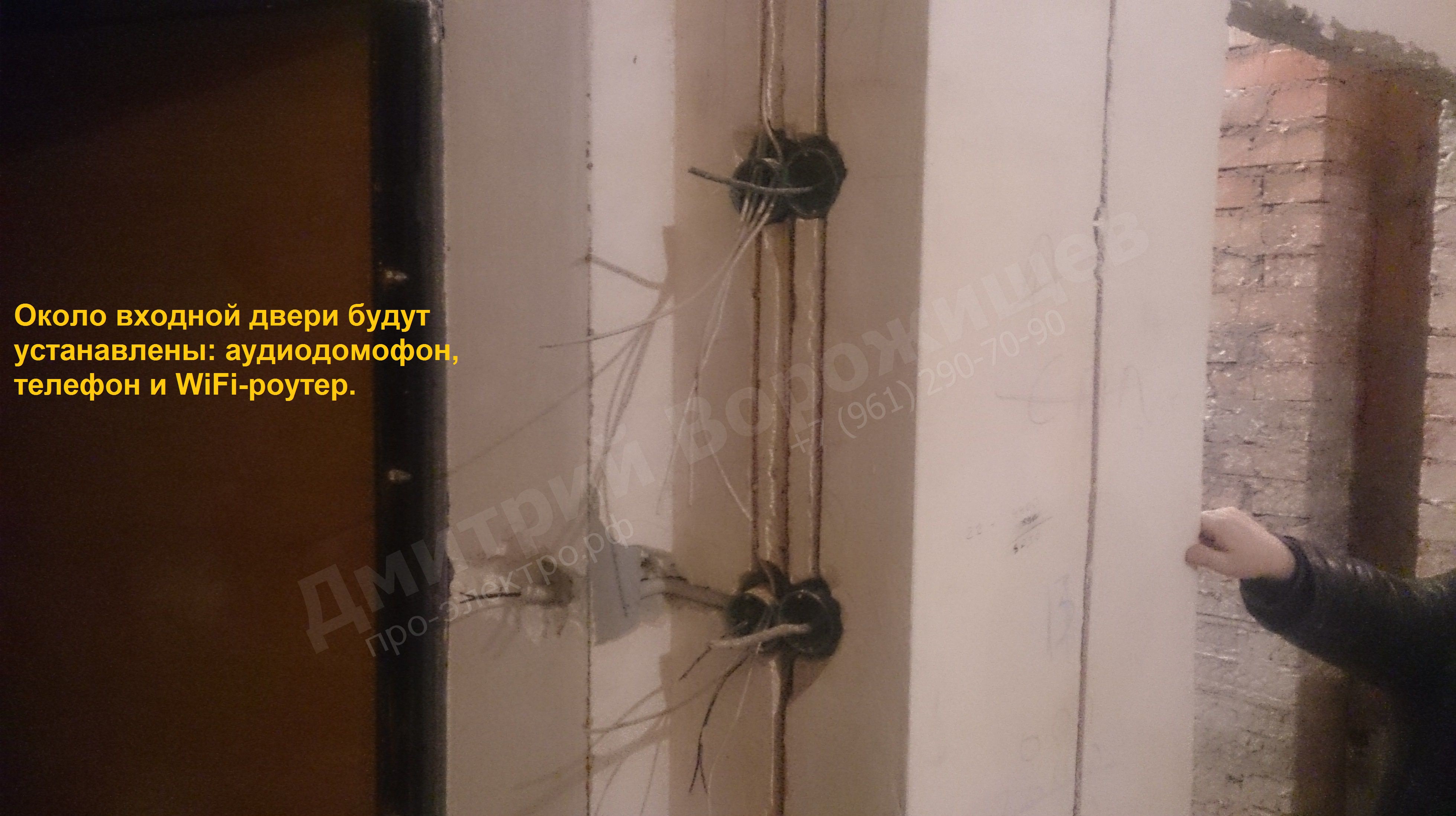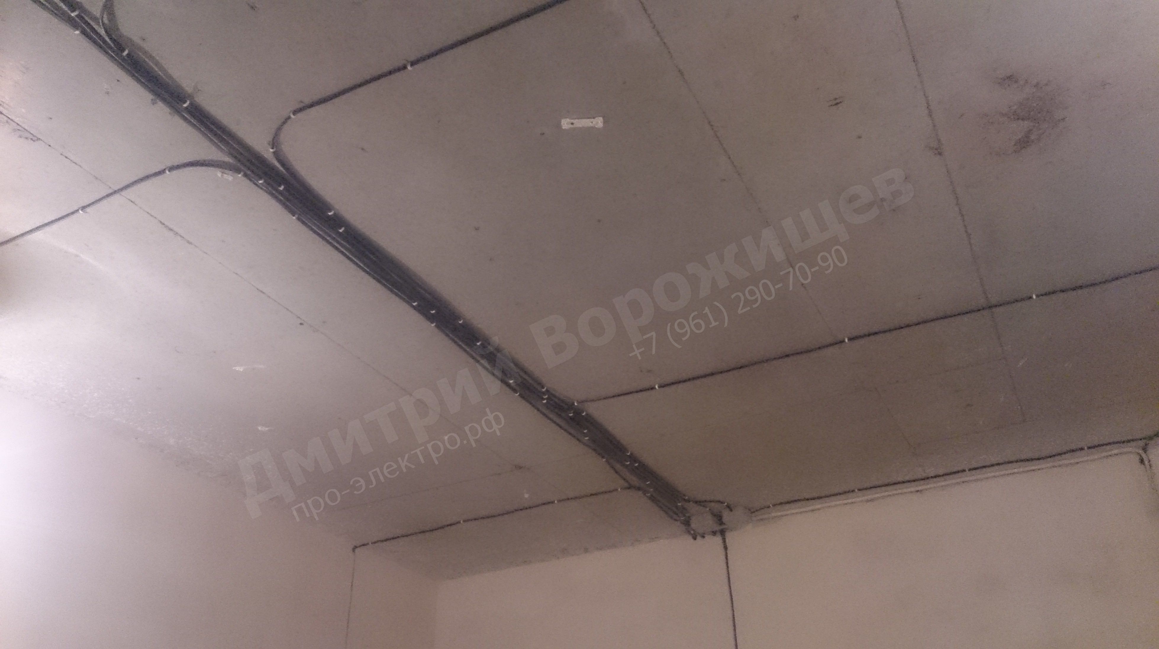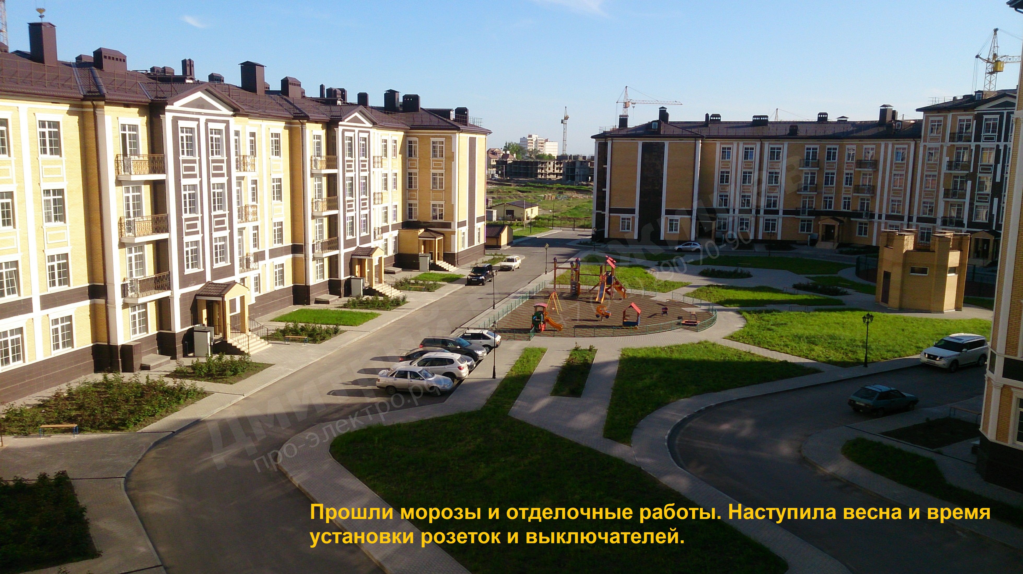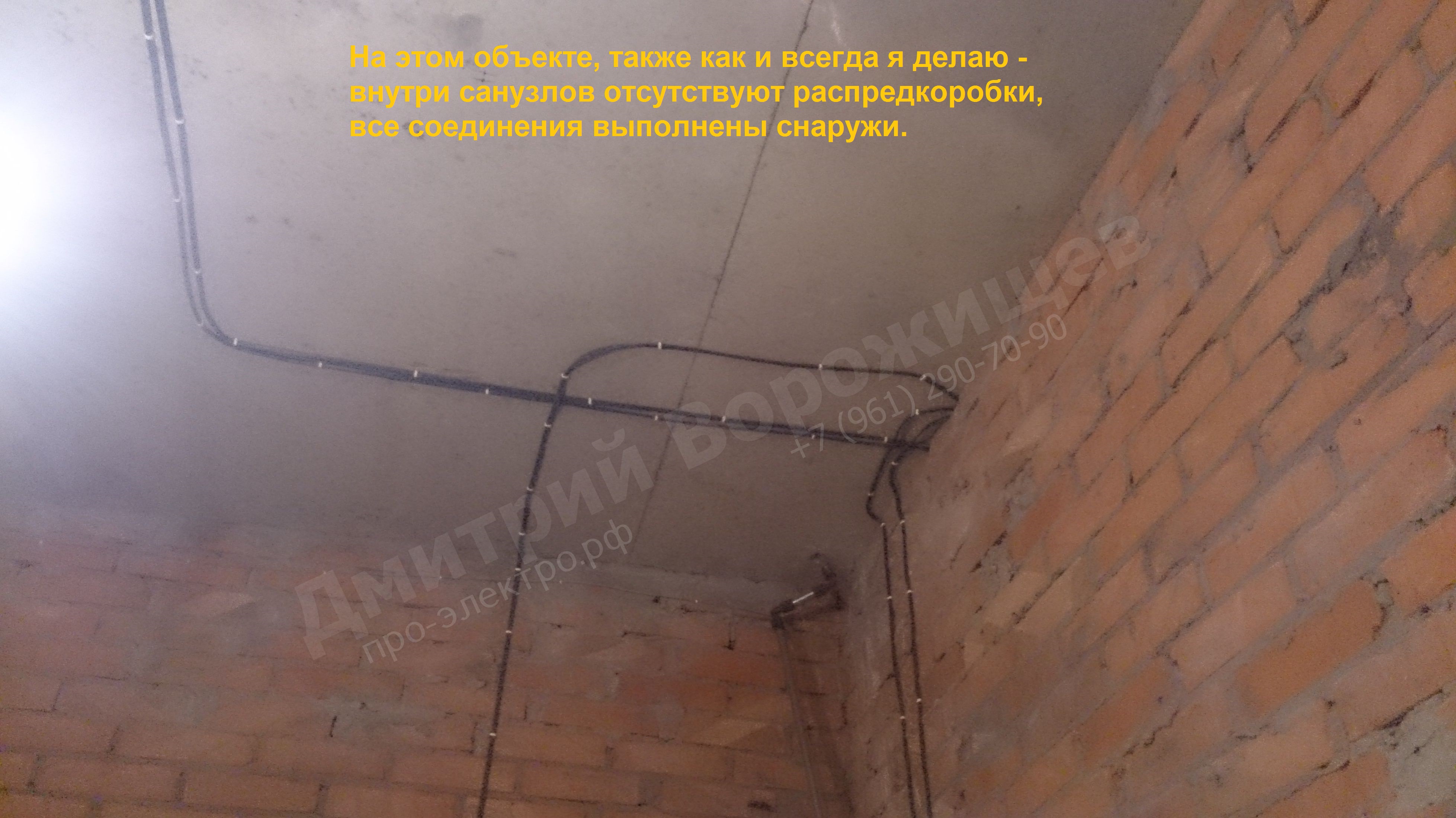 Монтаж электропроводки в 2к квартире ж/к "Чеховский сквер"Тип объекта: Квартира Площадь: 50-100 м. кв. Тип оборудования: Модульное ЗКО (защитно-коммутационное оборудование), ЭУИ (Электроустановочные изделия - розетки, выключатели, переключатели ...) , Слаботочные сети (Оборудование безопасности, компьютерные сети ...) Просторная квартира в элитном жилищном комплексе. Уйма контрастов. Подъезд замощен керамогранитом, но устанвлены плохие китайские автоматы в этажном распределительном электрощите; высокие потолки (3,5 м!), но кривые плохосложенные межкомнатные перегородки. Электромонтаж на объекте стандартный - прокладка кабеля ВВГнг-LS по потолку.