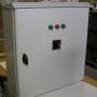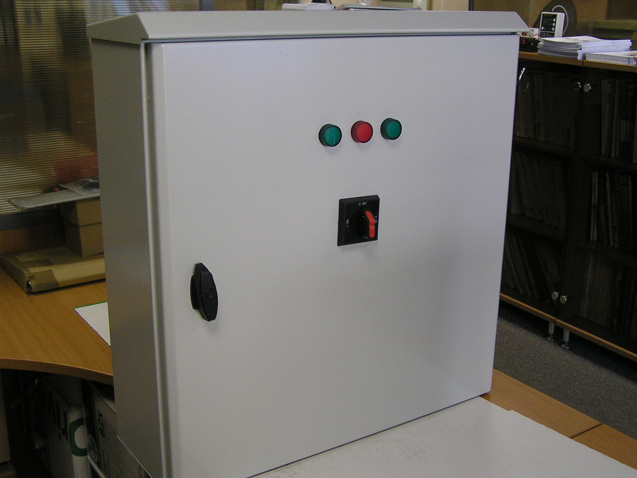Уличный стальной щит с козырьком. На двери ручка рубильника и лампы индикации.