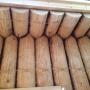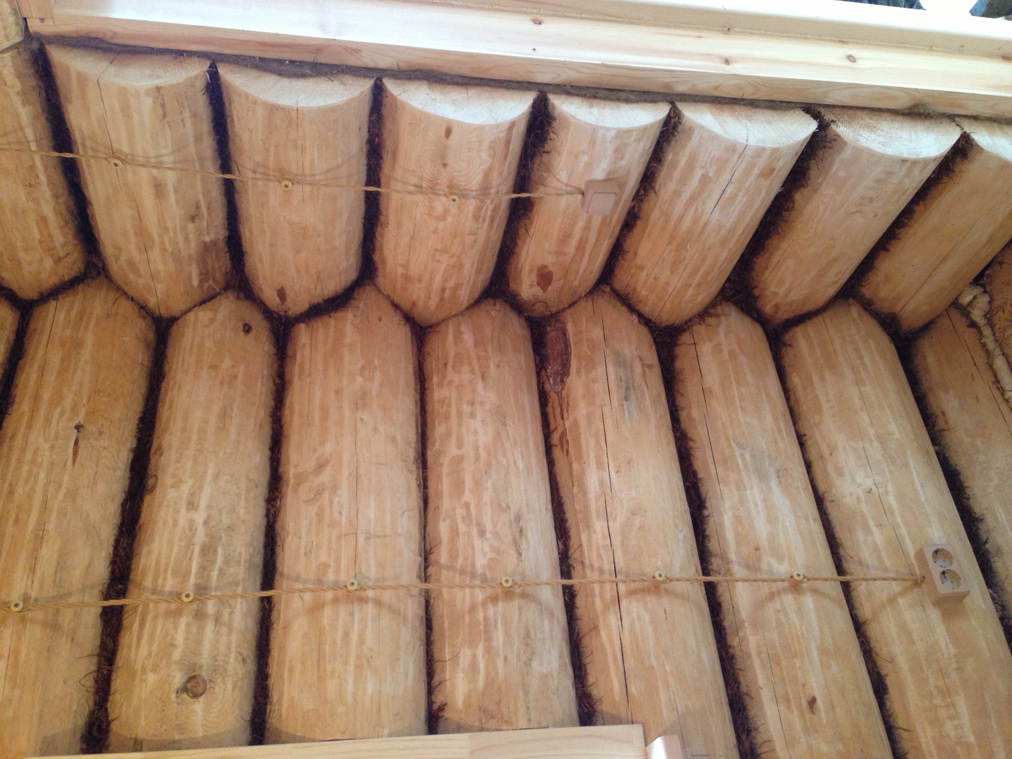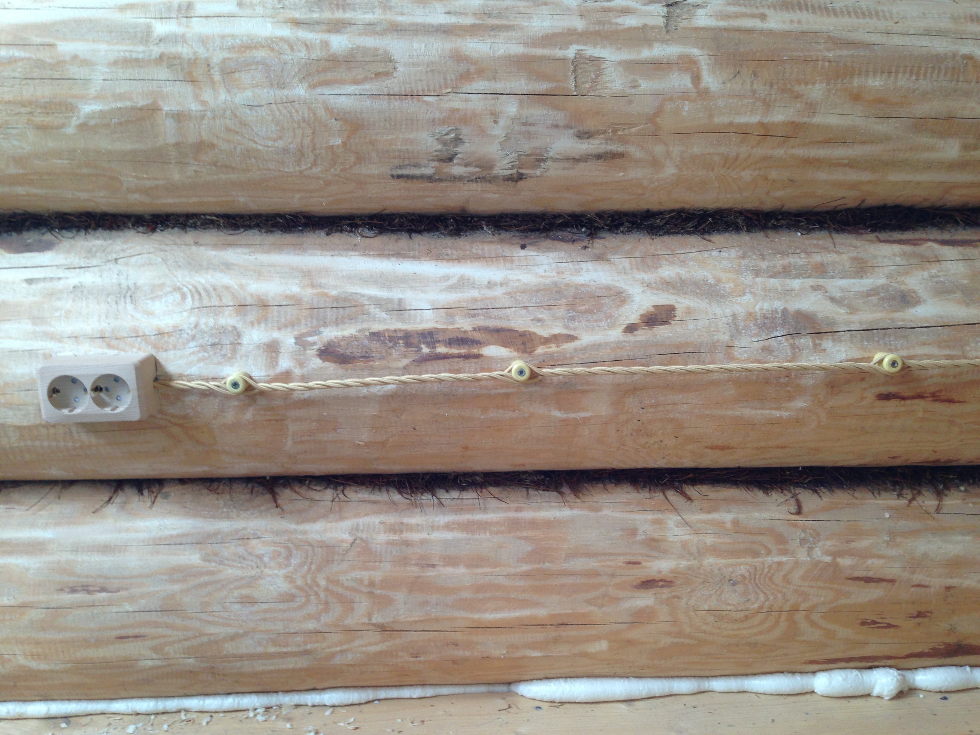 1 этаж сделан из оцилиндрованного бревна, поэтому электропроводка выполнена ретро-кабелем на изоляторах.