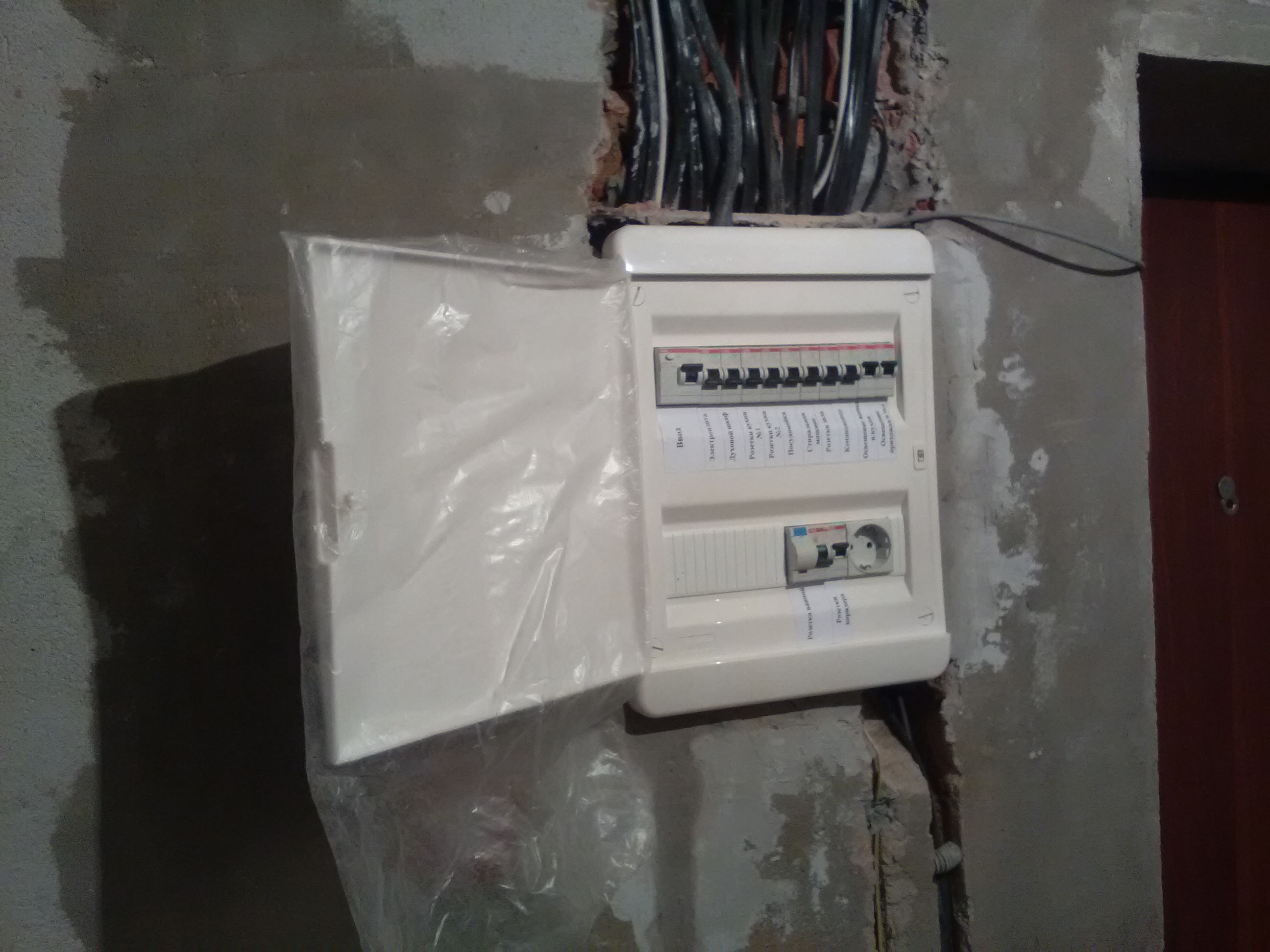 Однушка ЖК Новый городТип объекта: Квартира Площадь: До 50 м. кв. Тип оборудования: Другое оборудование Однокомнатная квартира. Разводка электрики организована по потолку без распределительных коробок. Щит застройщика заменили на Tekfor 24 модуля. Автоматы, УЗО и дифавтомат фирмы АВВ, розетка в щитке ИЭК. Кабель использовали ВВГнг производства Калужского кабельного завода.