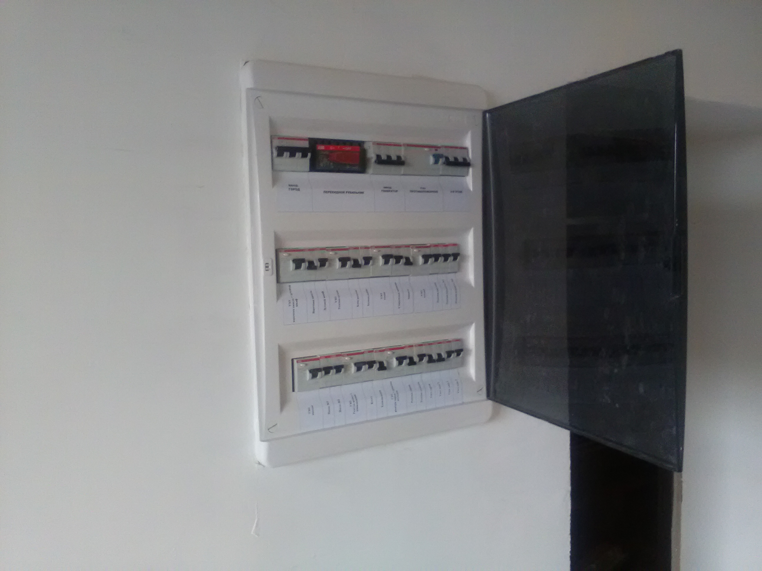 КоттеджТип объекта: Коттедж Площадь: 100-250 м. кв. Тип оборудования: ЭУИ (Электроустановочные изделия - розетки, выключатели, переключатели ...) Коттедж. Площадь 150 кв.м. Электропроводка организована по потолку без распределительных коробок, все соединения в подрозетниках. В щитке установлен перекидной рубильник для переключения питания от города на питание от генератора. Вся автоматика в щитке ABB, щиток Tekfor, розетки и выключатели Schneider Electric.
