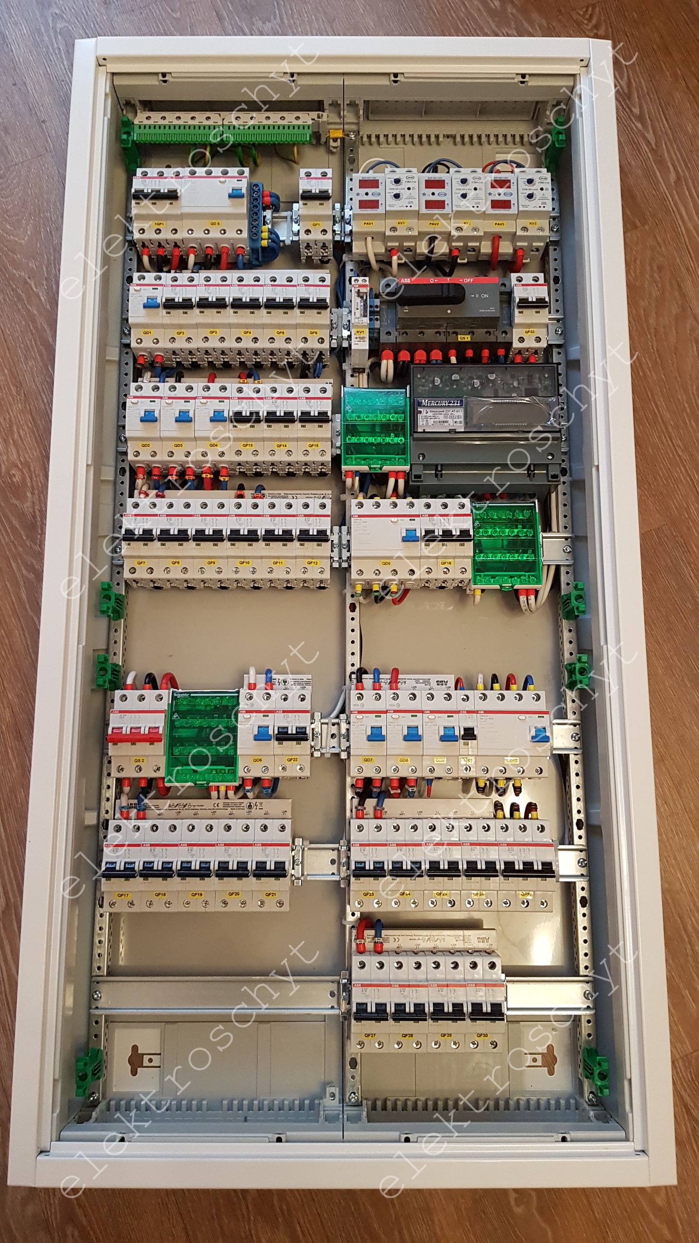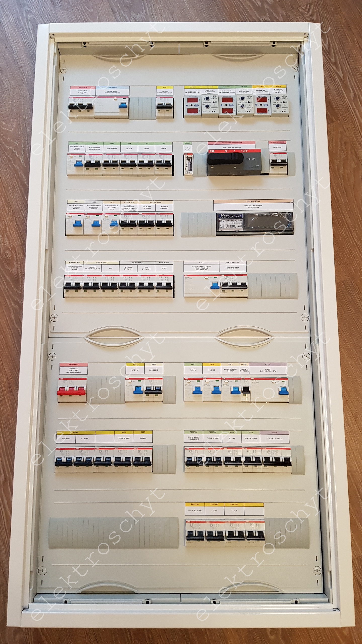 Распределительный щит ABB AT72 на 168 модулей.Тип объекта: Коттедж Площадь: Более 250 м. кв. Тип оборудования: Модульное ЗКО (защитно-коммутационное оборудование) Сборка щита трехфазного распределительного ABB AT72 на 168 модулей для коттеджа г. Москва. В щите установлены: автоматы 2Р, УЗО, защита от скачков напряжения УЗМ-51М, вольтамперметры, реверсивный рубильник для генератора, счетчик для учета электрического отопления.