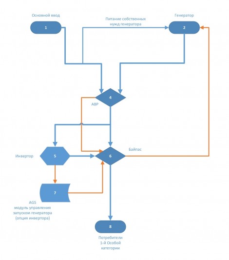 Резервное питание в частном доме с нюансамиЗаказчик обратился со следующей проблемой. У него частный загородный дом. Основной ввод – трехфазный по ВЛ. Несколько раз в год случаются аварии продолжительностью до нескольких дней. Просадки напряжения и перекос фаз – регулярное явление. Несколько последовательно сменившихся команд "специалистов", пощипав бюджет, с задачей не справились, бросив ВРУ в состоянии при котором переключения источников приводили к КЗ. Разделение потребителей по категориям не производилось. Более того, по рекомендациям этих «лучших собаководов» были приобретены газовый генератор и инвертор. Все бы ничего, но и генератор и инвертор однофазные. При этом, генератор «умеет» автозапуск только по пропаданию напряжения контролируемого входа ~230В. Инвертор может управлять запуском генератора посредством опционального модуля управления генератором AGS, имеющего только цепи управления, рассчитанные на максимальное напряжение 30В. Задача: Разработать щит ВРУ, который позволил бы: 1- - Разделить потребителей на приоритетных и низкоприоритетных. - Реализовать АВР, имеющий трехфазный и однофазный (от генератора) вводы и отключающий низкоприоритетных потребителей в случае аварии основного ввода. - Питание приоритетных потребителей осуществлять через инвертор. - Подключение инвертора выполнить через ручной байпас, который позволил бы в случае выхода из строя или обслуживания инвертора питать приоритетных потребителей напрямую от АВР. При этом, в случае включения байпаса в положение «от АВР», управление генератором не должно быть завязано на AGS. - При питании приоритетных потребителей от инвертора (байпас в положении «от Инвертора») запуск генератора должен быть осуществлен при снижении уровня заряда АКБ инвертора ниже заданного (предварительно – ниже 40%). При восстановлении заряда выше заданного (предварительно – 90%) генератор должен быть выключен. - Инвертор поддерживает режим добавки мощности. Благодаря ему, если нагрузка сегмента приоритетных потребителей превысит номинальную выходную мощность инвертора, инвертор посредством AGS запускает генератор и мощность генератора и инвертора суммируются. Исходя из поставленной задачи, напрашивается следующая структурная схема: Используя максимально доступные компоненты, данная структурная схема может быть реализована следующим образом. Упрощенная однолинейная схема: Монтажная схема (разрабатывалась для размещения в двух существовавших у заказчика оболочках): Как это было реализовано "в железе" (с использованием одной новой оболочки и ряда доставшихся от предшественников компонентов)::